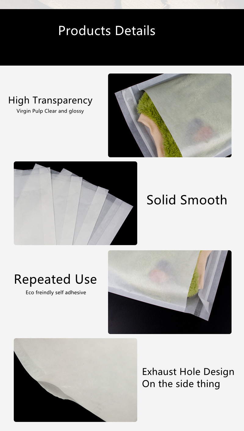 GLASSINE PAPER BAGFeatures*Industrail Use: Shoes & clothing *Sealing & Handle:Self Adhesive *Custom MOQ:10000 pcs *Feature: Biodegradable、Water and grease resistant、Smooth、semi-translucent *Dress length: Floor length *Custom: accept customize size, color and logo printing The newest trending in packaging industry-- Glassine Paper Bag.Glassine is a glossy, thin paper that is air, water, and grease resistant. Glassine isn’t fully waterproof, but it still offers decent protection against the elements. Despite being glossy and smooth, Glassine is still made with only wood pulp.