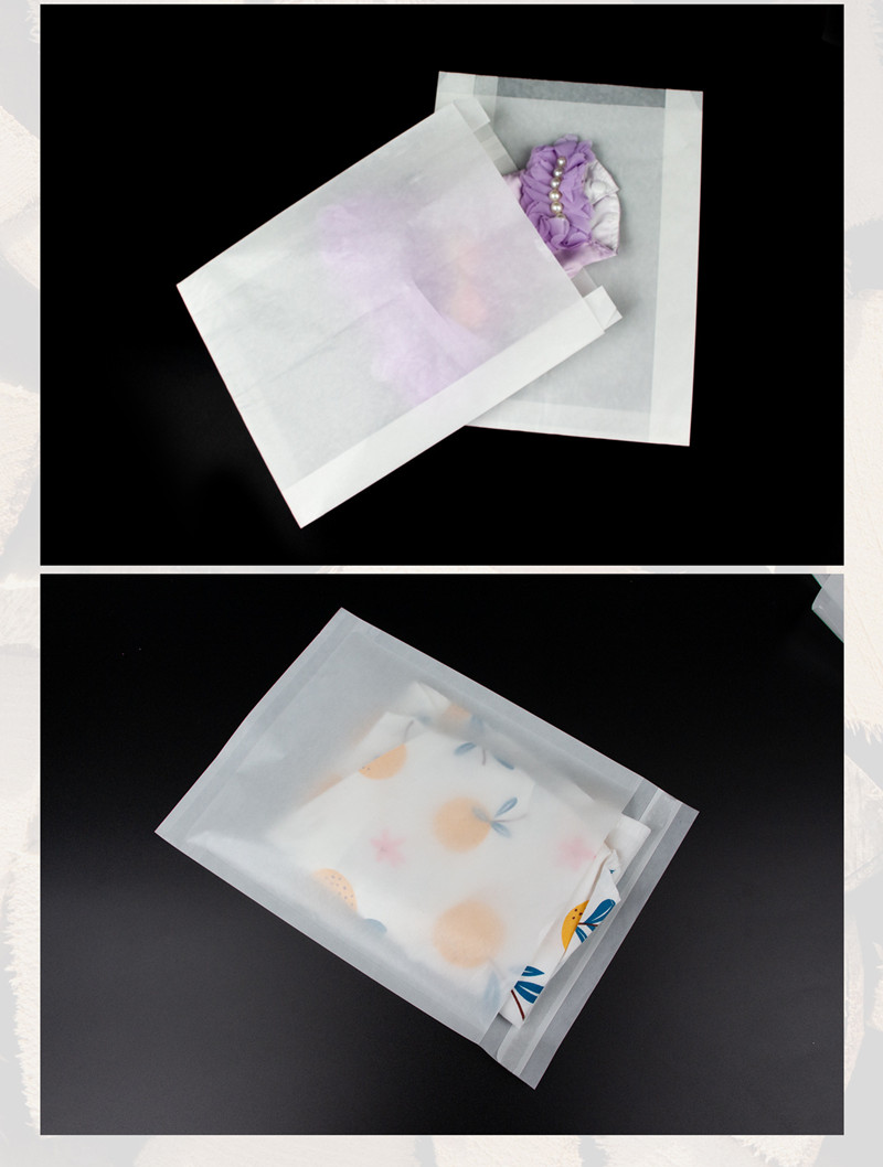 Glassine paper bags made of transparent paper which is more and more widely used. Shopping in supermarkets, shopping malls, shoe stores, clothing stores and other places is wide to packaging purchased items Custom Design and Logo We offer custom printing service and MOQ is 10000pcs, Stock size(MOQ is 1000pcs): 15*17+4CM 20*24+4CM 27*35+5CM 35*40+5CM 40*50+5CM How is glassine different from standard paper?